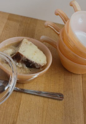 *Fill microwave proof bowls half-way with hot soup: float the toast on top. Cover the toast generously with the Swiss cheese. Place 2 or 3 bowls (in a circle) in the microwave. Cook, uncovered, on medium power (Each microwave is different. Check to see what medium power is for your model) until cheese melts.