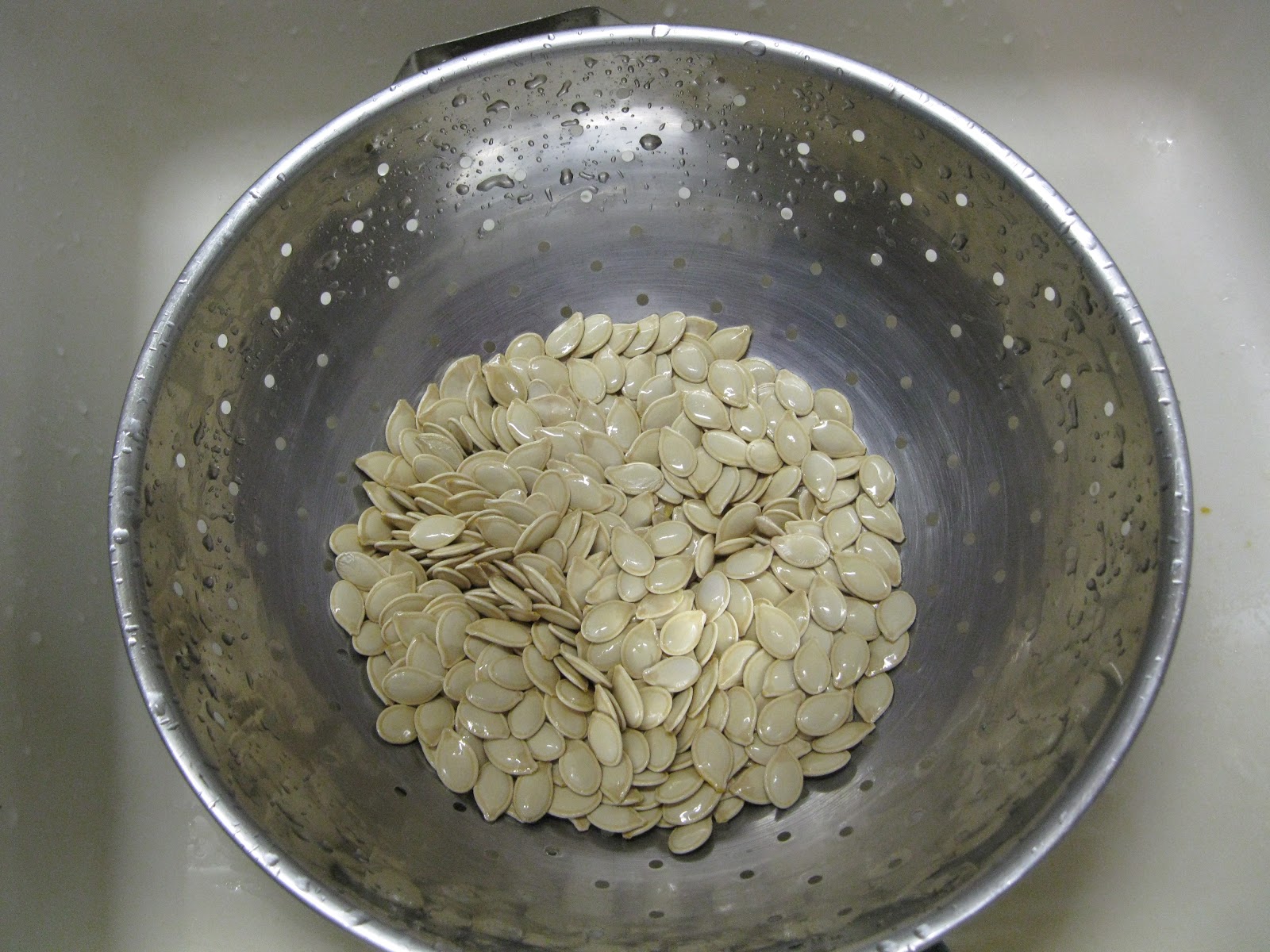 1. Heat oven to 250 degrees. Line a baking sheet with parchment paper. Cut pumpkin open and remove seeds. Separate flesh from seeds and discard flesh. Spread seeds on parchment in an even layer. Bake until dry, stirring occasionally, about 1 hour. Let cool.