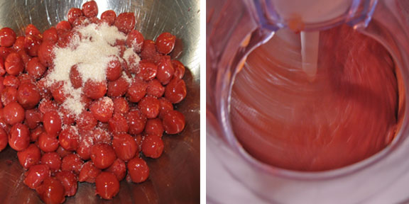 1. In a medium bowl, combine the cherries (if using canned cherries drain off juice) and sugar. Let them macerate for 30 minutes, then puree the mixture in a food processor or blender. Push the puree through a fine sieve and stir in the Syrup, 1/3 cup water, and the ascorbic acid or lemon juice.