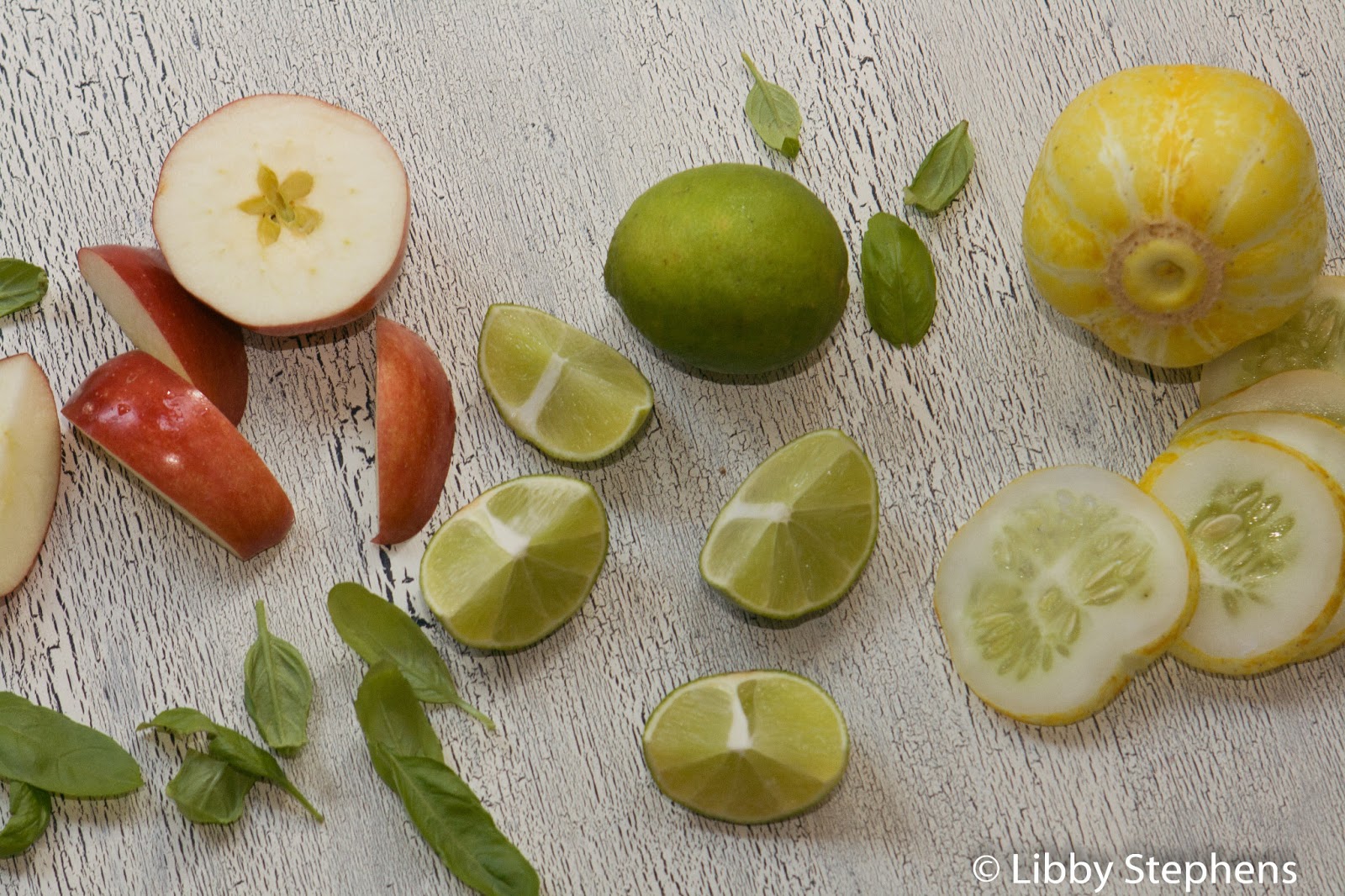Starting with the basil, juice everything into a glass.
