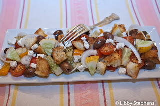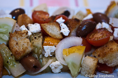 Add the feta, olives, and bread to the vegetables in the bowl, add the vinaigrette, and toss lightly.