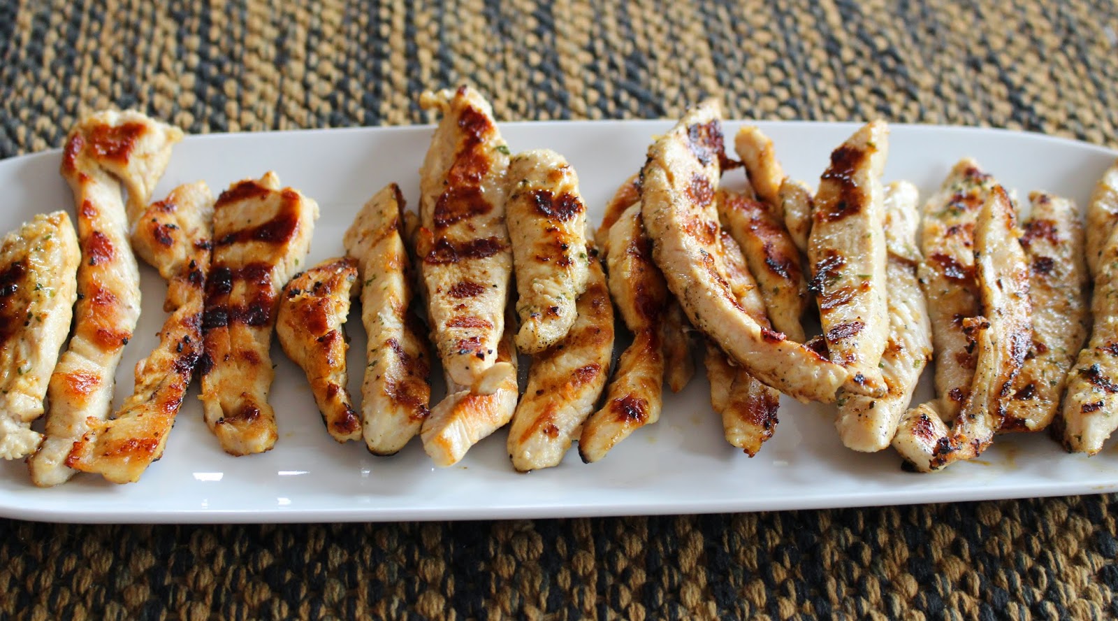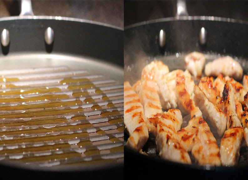 5. Grill chicken strips on both sides until you see the golden brown grill marks and test for doneness. (The grill pan puts nice grill marks on the strips.)