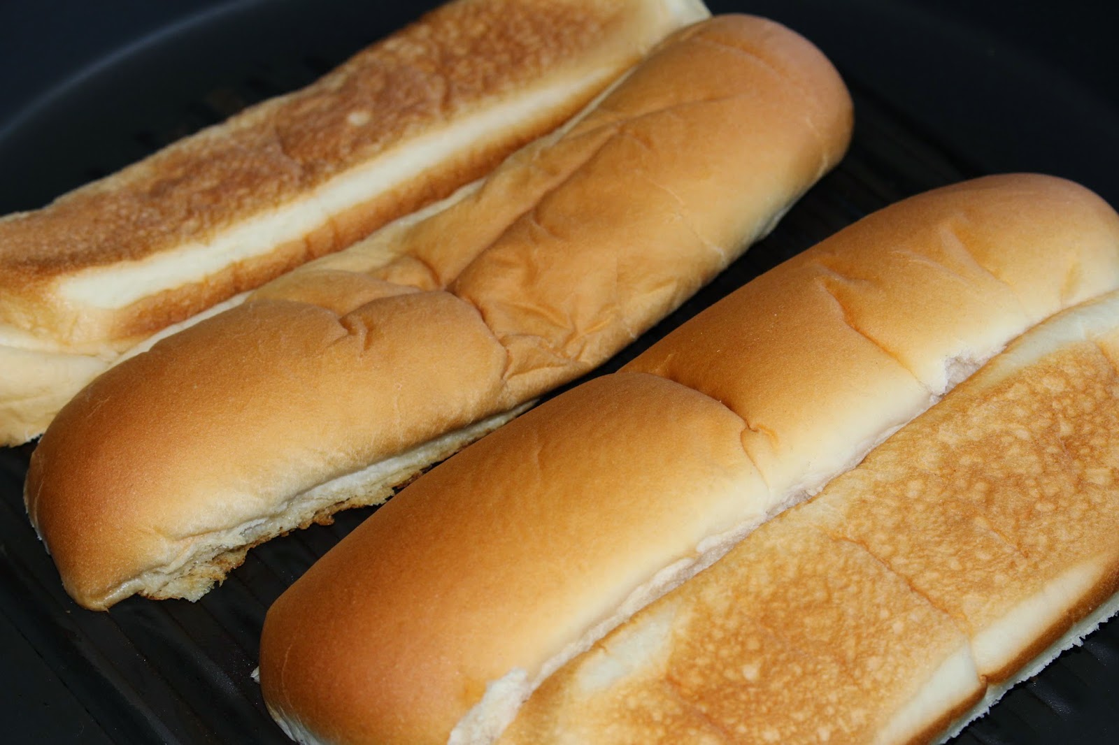 3. Toast the buns while the sauce is warming. Open buns carefully, butter the inside. Place on a warmed grill pan and toast till grill marks appear.