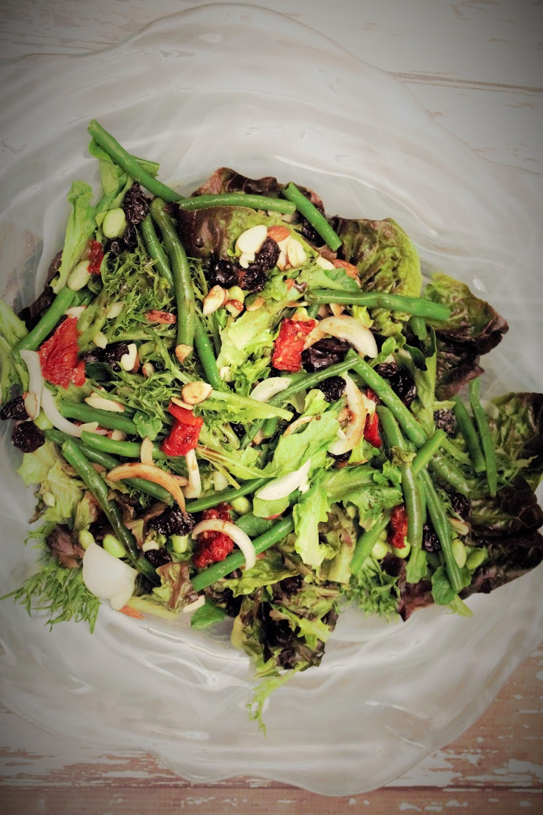 This salad is mixed greens, blanched green beans, edamame, sliced almonds, dried cherries, and chopped tomatoes with a balsamic dressing.