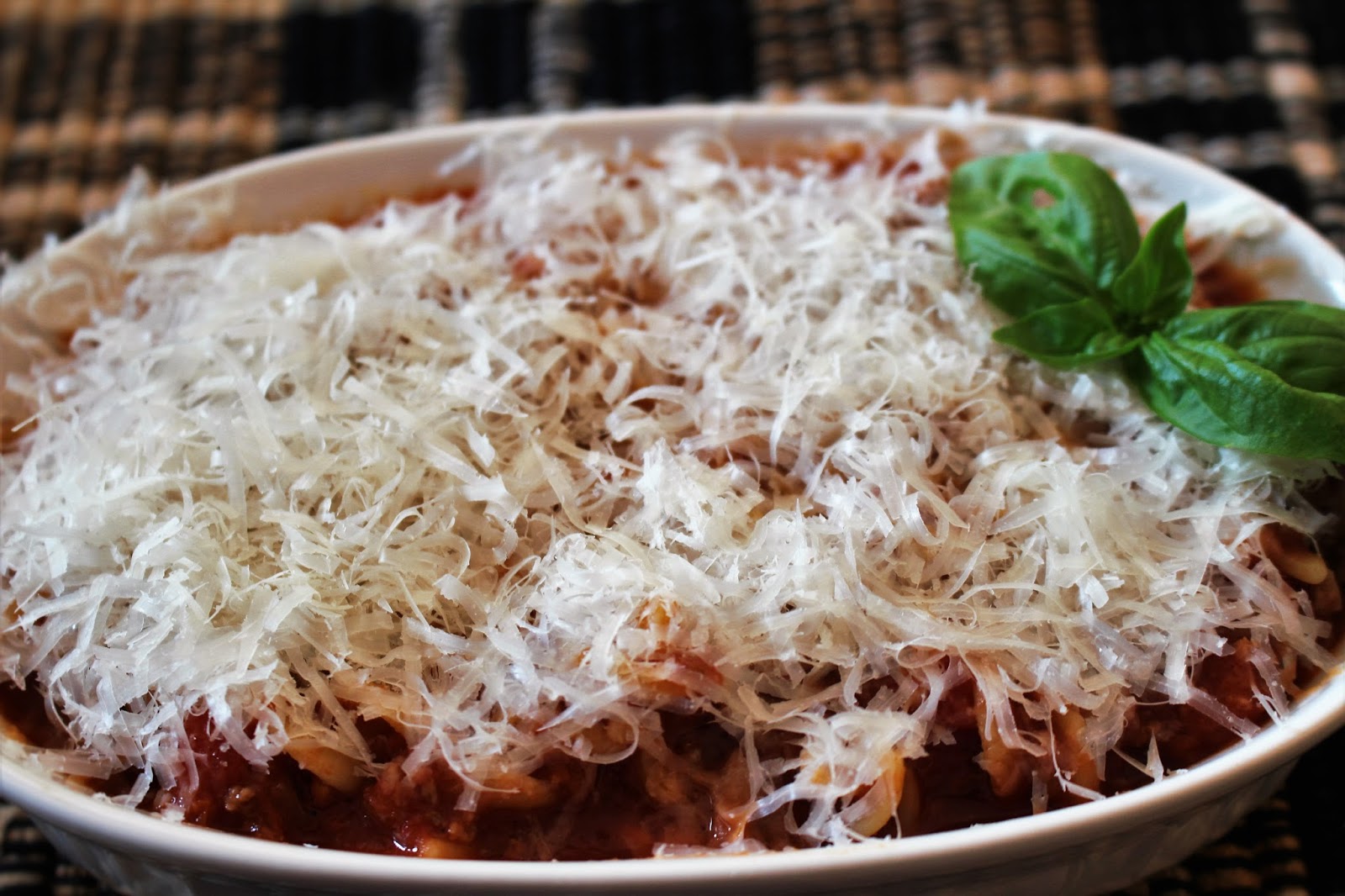 For this recipe I have combined pasta and homemade sauce; added a layer of goat’s milk yogurt cheese with grated Pecorino Romano cheese; and a sprinkle of Pecorino Romano on top for the finish. (I am using goat’s milk yogurt cheese and Pecorino (sheep’s milk cheese) because I cannot tolerate cow’s milk or cheeses.)