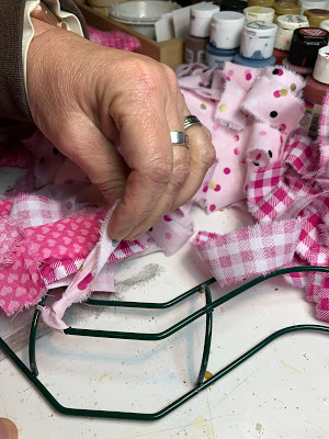 2. Take a strip of fabric, make a loop over the wire frame pulling the ends tight through the loop making a hitch knot. Alternating the different fabrics filling the wire frame.