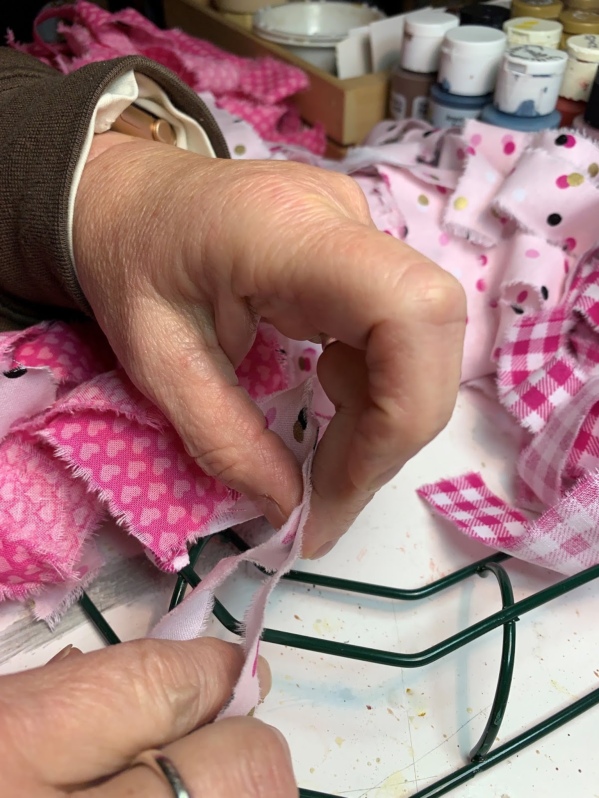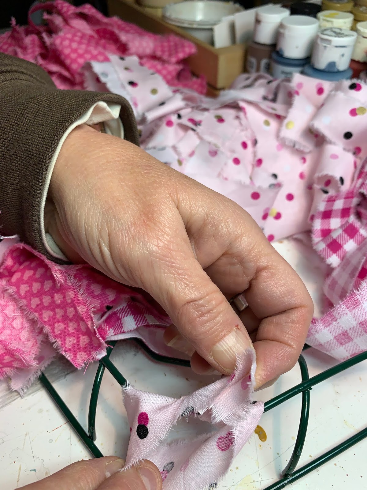 2. Take a strip of fabric, make a loop over the wire frame pulling the ends tight through the loop making a hitch knot. Alternating the different fabrics filling the wire frame.