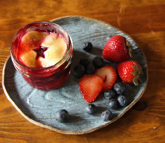 together the strawberries, blueberries, sugar, strawberry preserves,